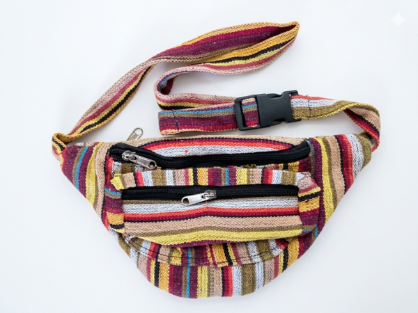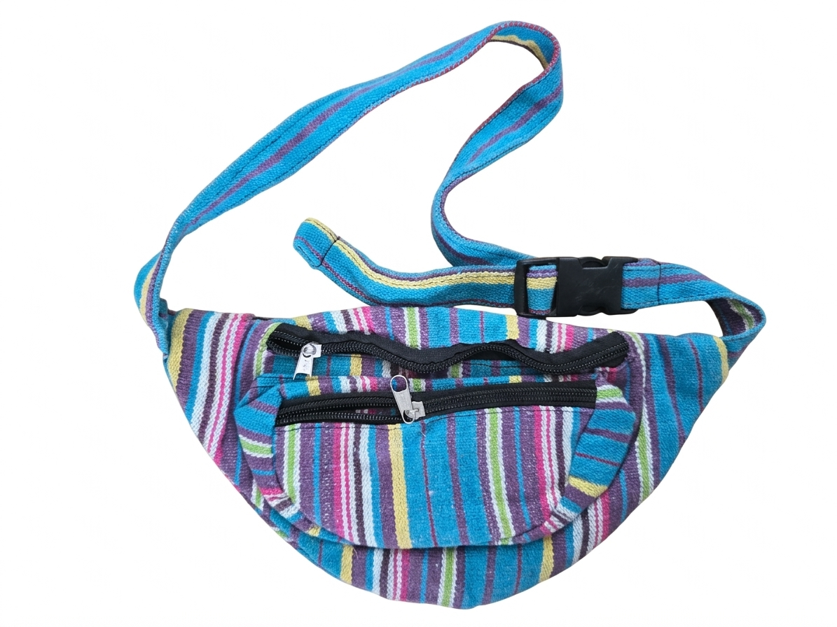 Unisex katoenen heuptas met ritssluiting. De tas heeft drie vakken: het hoofdvak is verdeeld in twee delen en er is een voorvak. De band heeft dezelfde kleur als de heuptas. De kleuren variëren en worden willekeurig geleverd.Afmetingen: ca. 27 cm x 14 cm.
