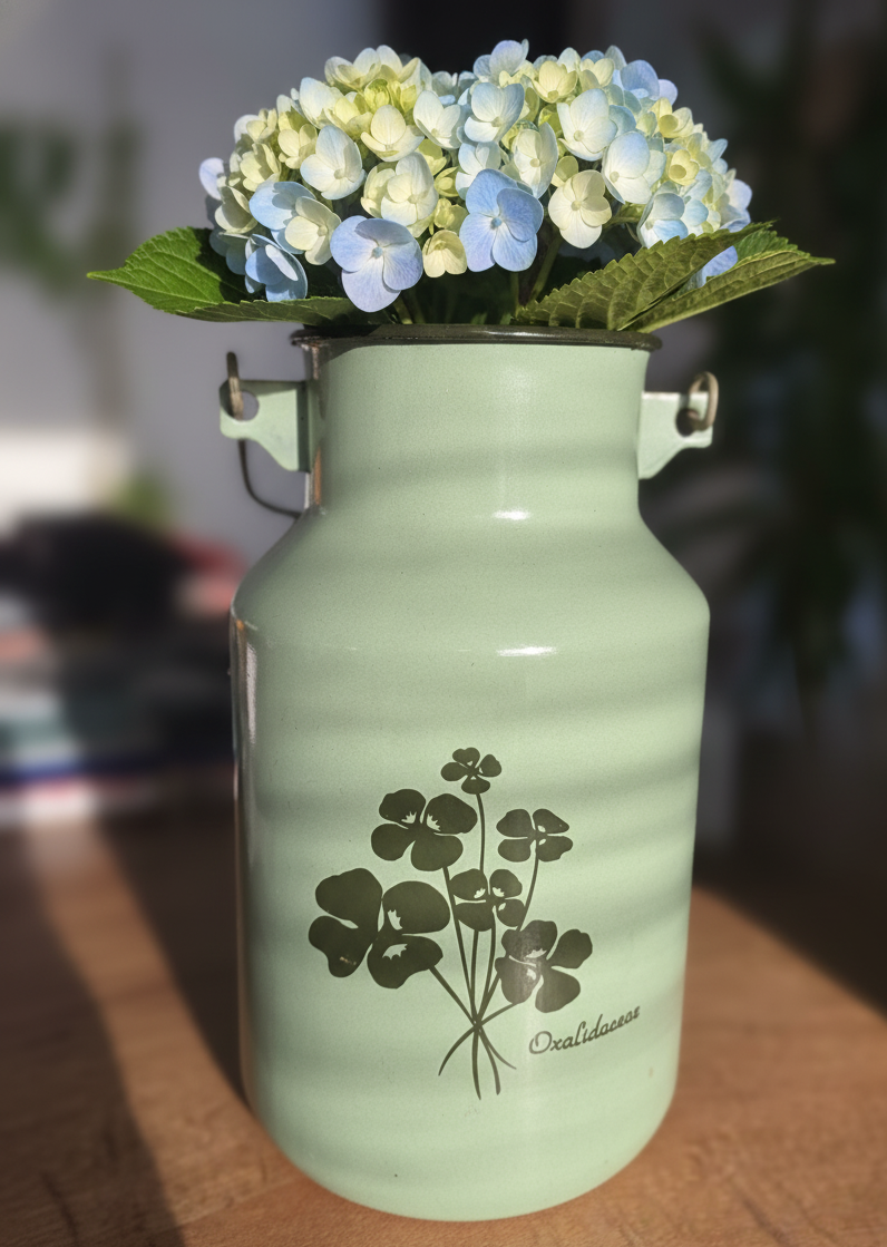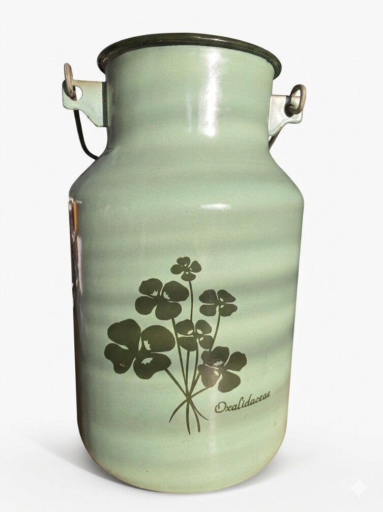Deze lichtgroene melkbus is dan misschien niet zo groot, Maar een mooi object voor in huis. Met een bloemetje of keukengerei erin.