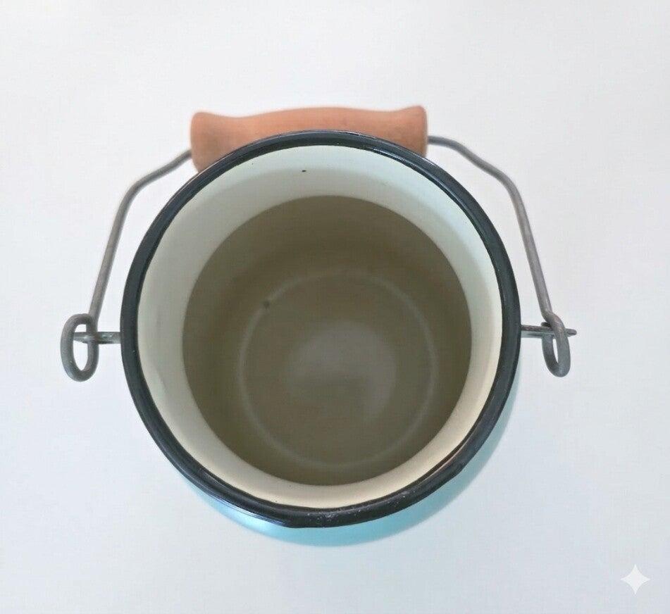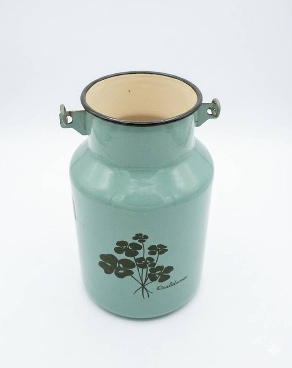 Jaren 70 mintgroene melkbus van emaille. Maat: 23 cm hoog en 14 cm breed.