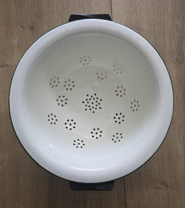 Vintage emaille vergiet jaren 70 met bakelieten handvaten.